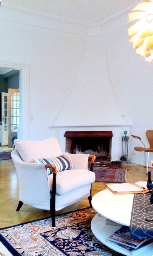 Fra den fritstående Zanotta WILLIAM chaiselong er der udsigt til hallen og den smukke pejs, som er fra husets oprindelse. Pejsekonstruktionen står i flot kontrast til de mørke vægge og udgør et skulpturelt indslag i indretningen af stuen.
