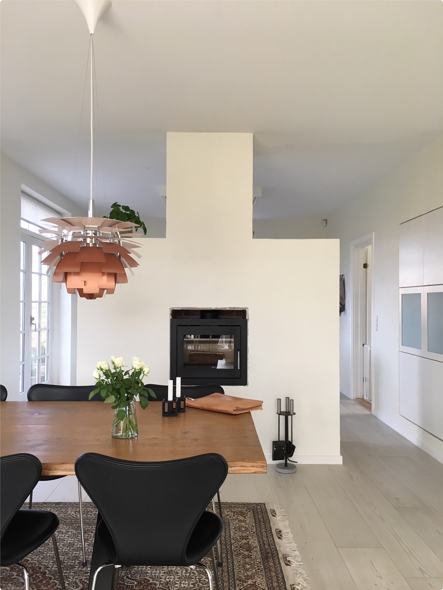 Væggen med den indbyggede brændeovn så anderledes ud inden LERCHE designs anbefaling om at ændre væggen blev til virkelighed. Se "FØR" billedet ved at klikke på "SE MERE" Møblementet havde parret allerede inden LERCHE design blev entreret til opdatering og indretning af parrets stue.